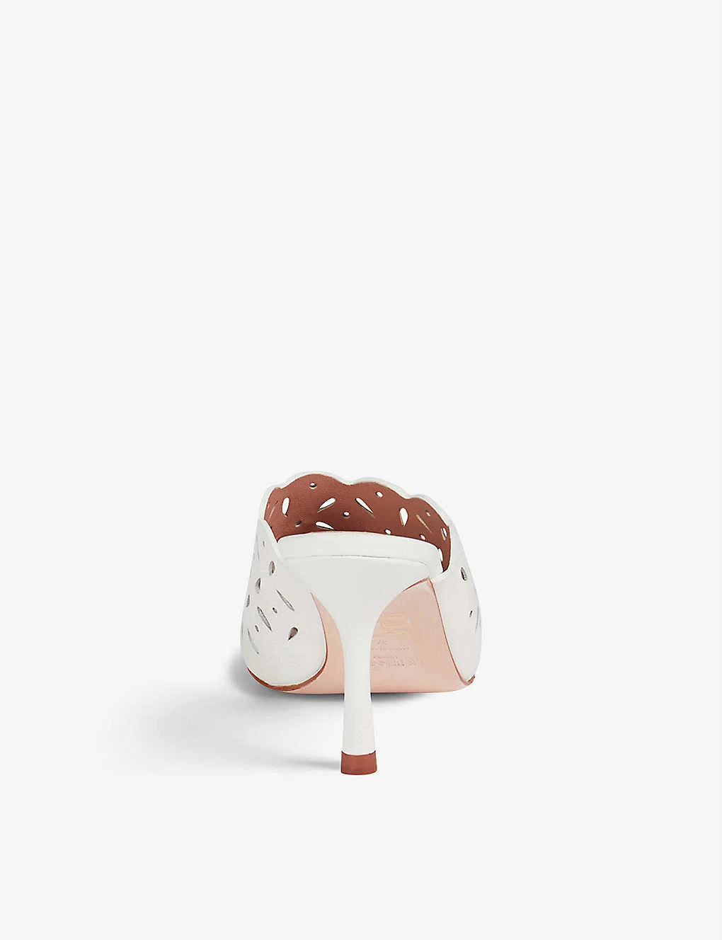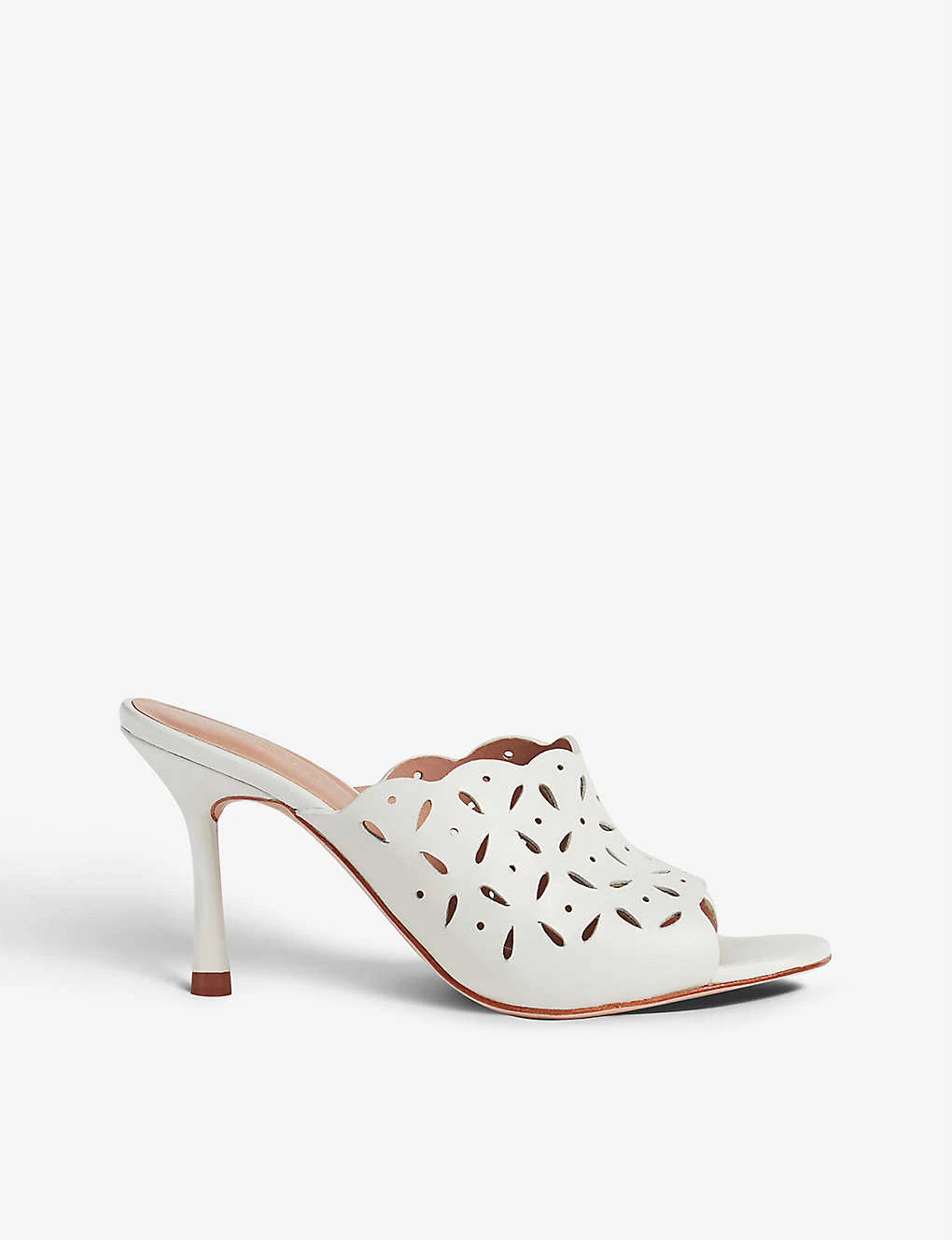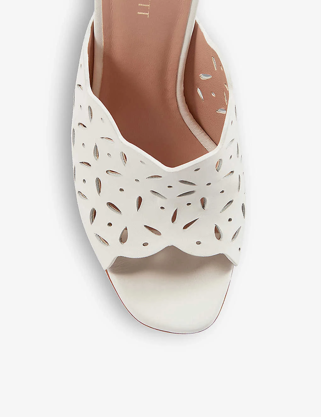- Square open toe, perforated pattern, scalloped edges, stiletto heel, backless