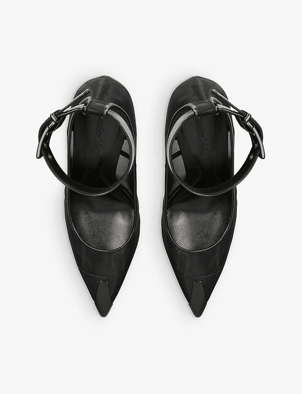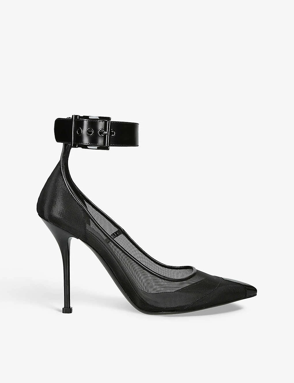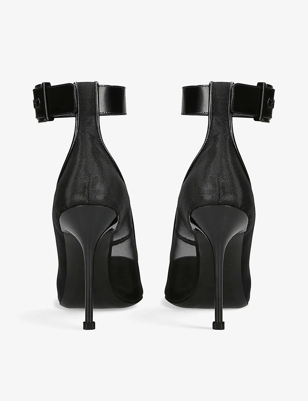 - Pointed toe, toe cap, strap around the ankle, stiletto heel, black-tone hardware