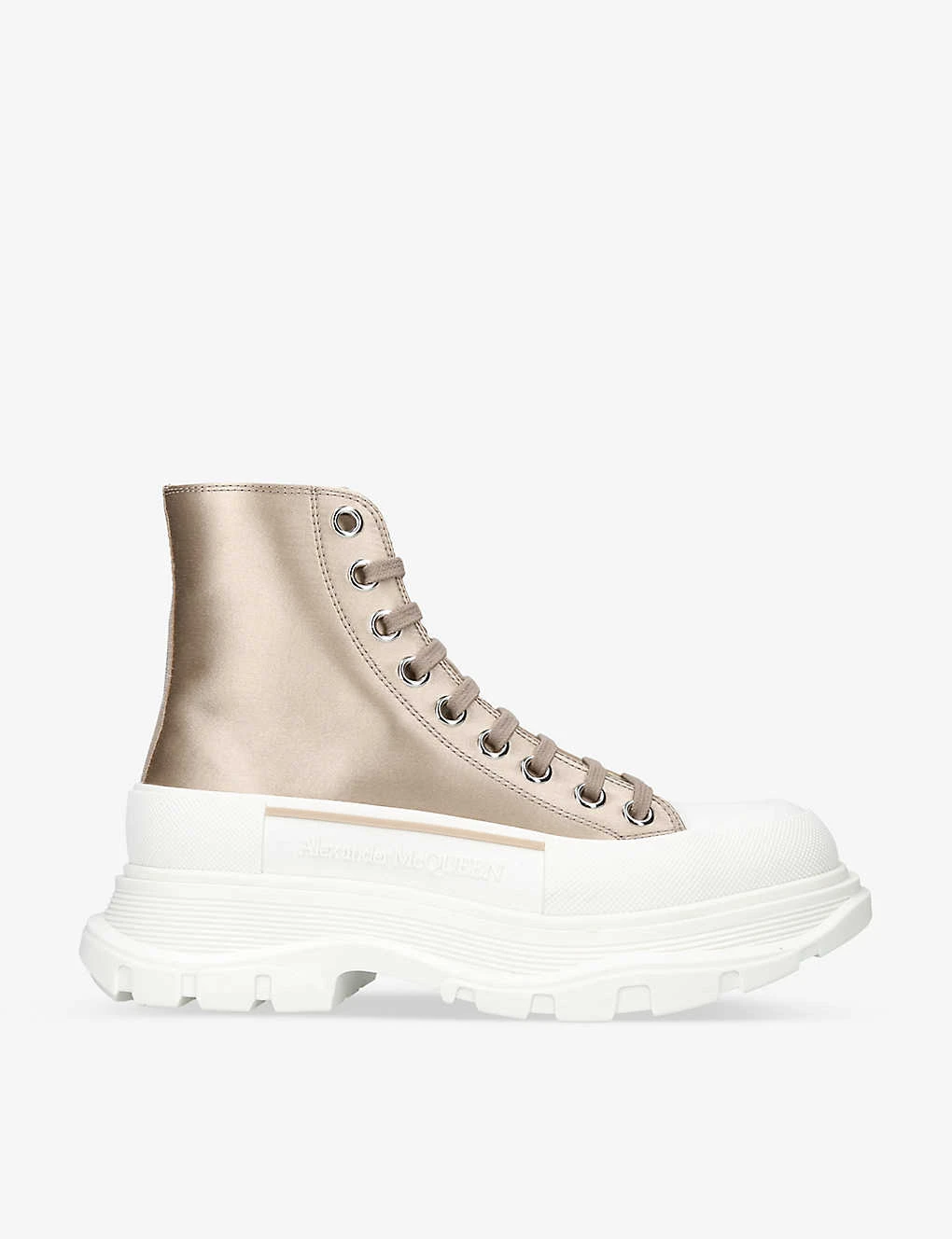 - Closed toe, round toe, metallic finish, logo-embossed sides, silver-toned eyelets, platform sole, tread outsole, branded insole