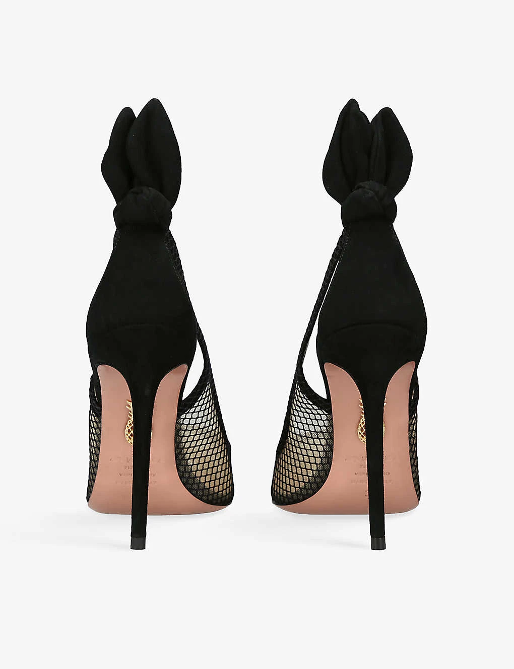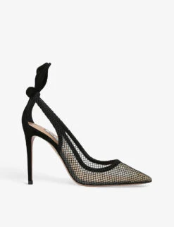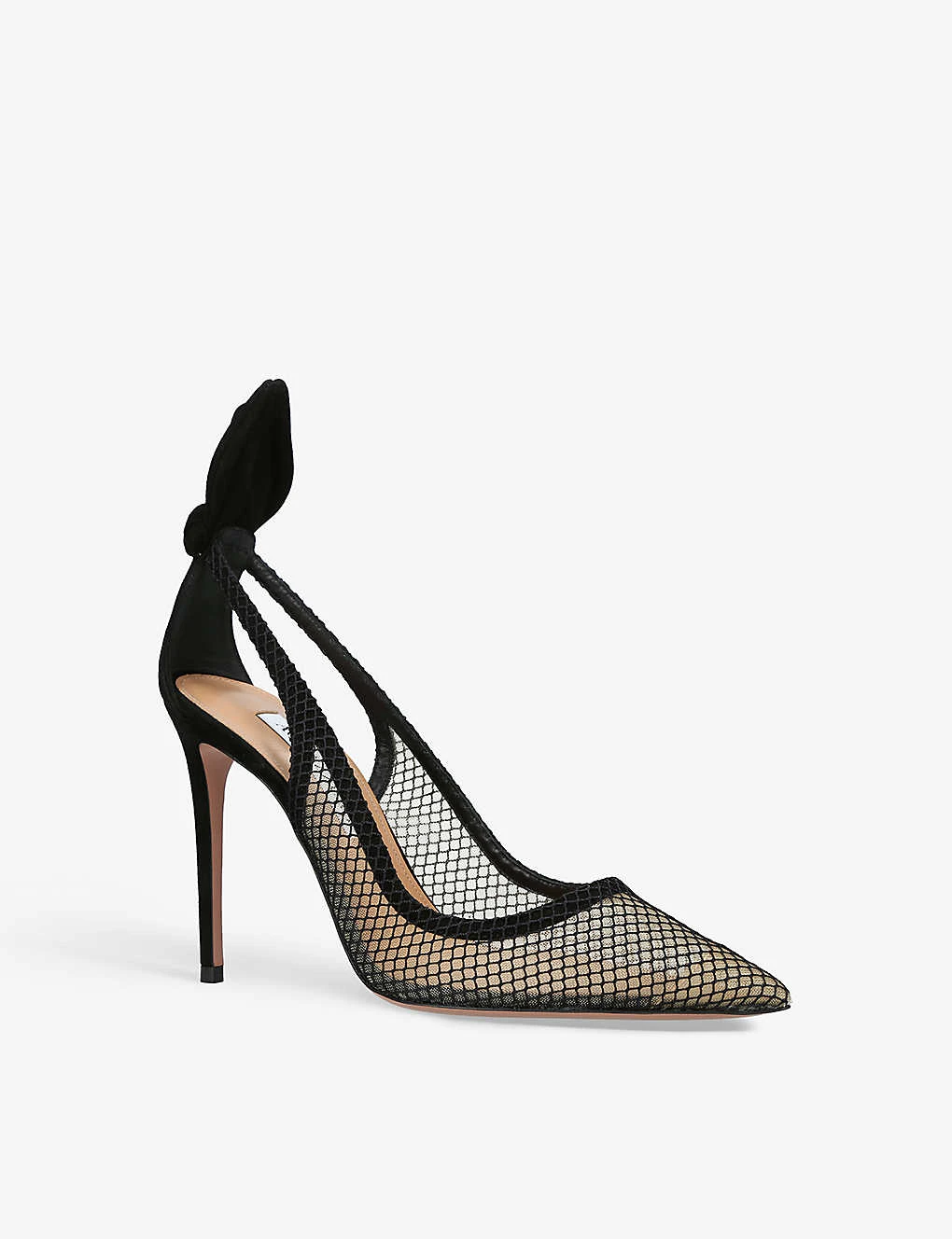 - Pointed toe, closed toe, curved back, stiletto heel, bow tie embellishment, mesh panel
