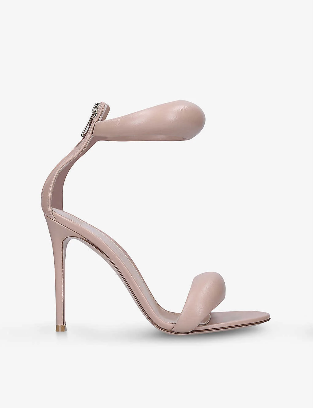- Almond toe, open toe, padded straps, zip at heel, stiletto heel