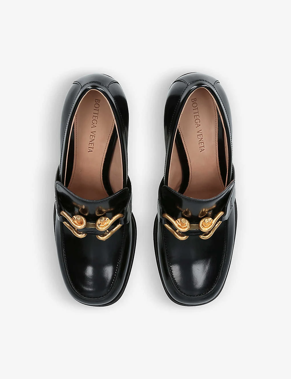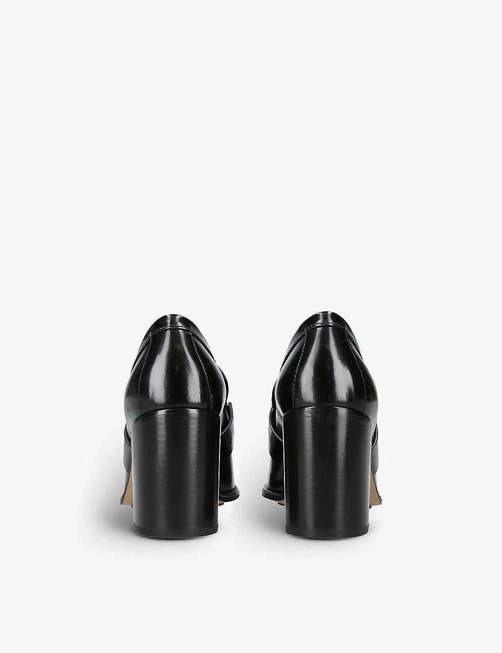 - Round toe, closed toe, block heel, Morsetto horse-bit hardware, gold-toned hardware, contrast stitching, branded insole