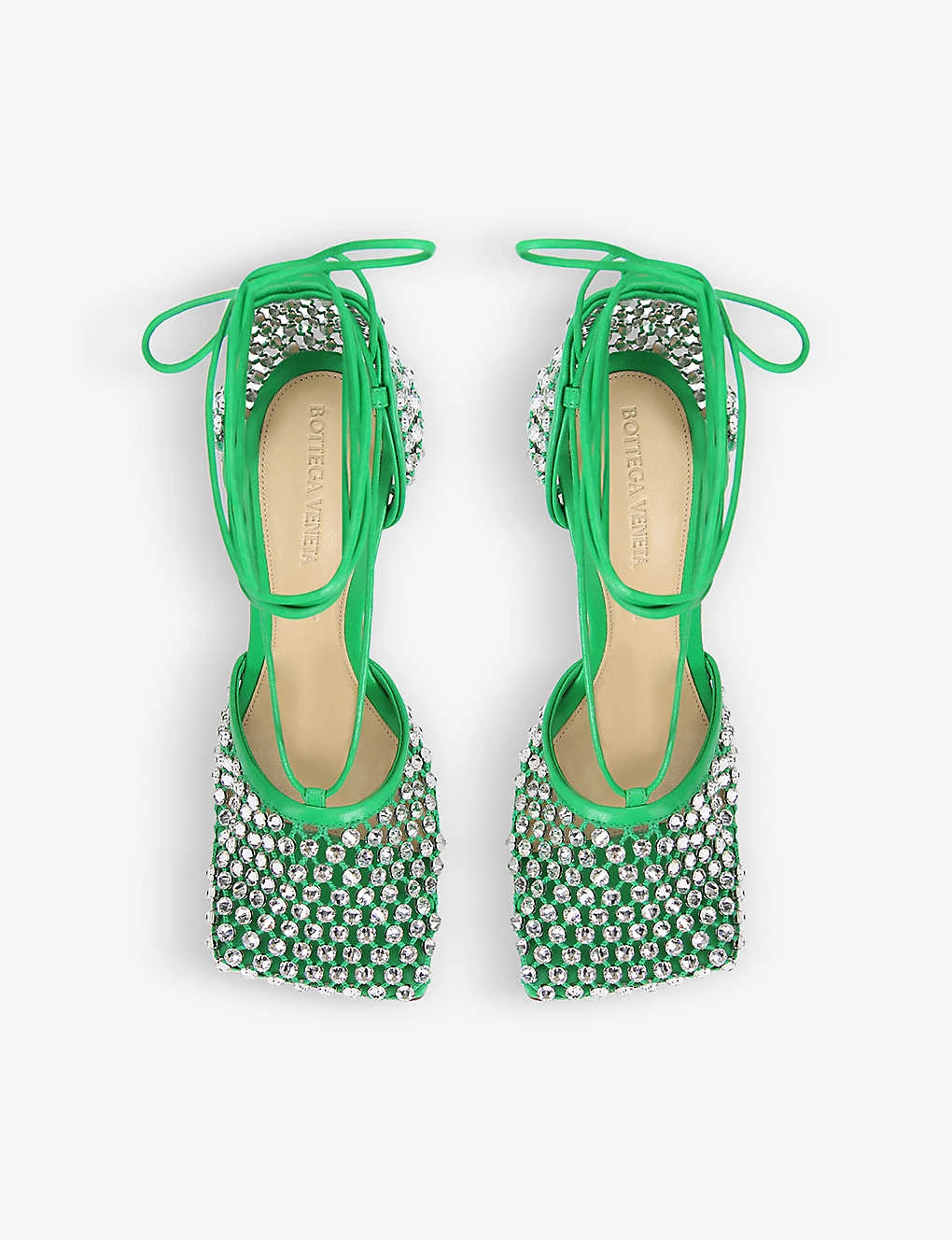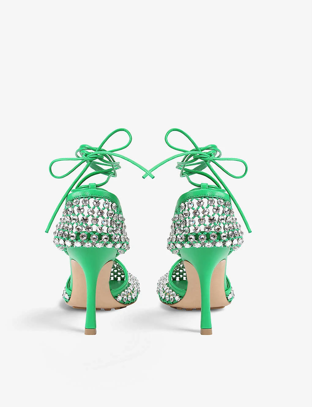 - Square toe, slender wraparound straps, crystal-embellished upper, stiletto heel, mesh design