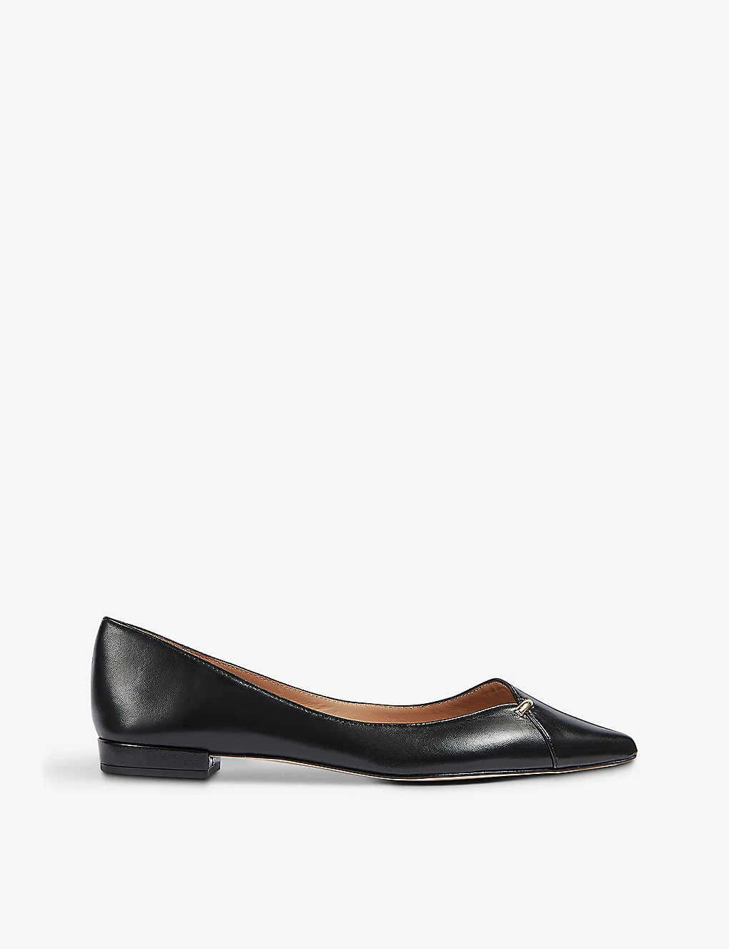 - Flat design, closed pointed toe, curved front panel, gold-tone nugget-shape hardware at front