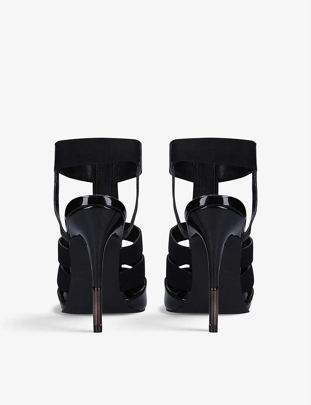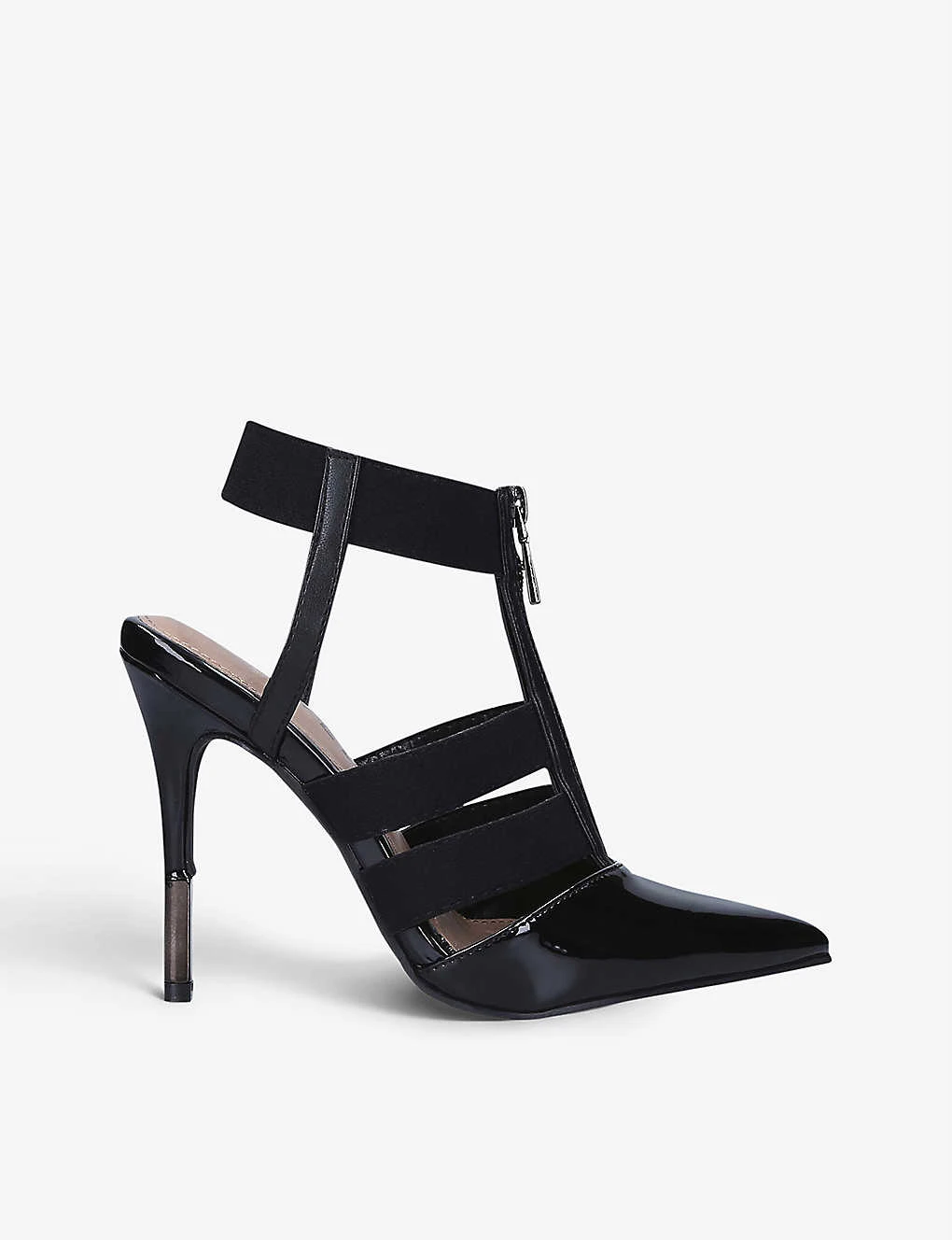 - Pointed closed toe, high stiletto heel, caged-effect straps, front zipper, silver-tone hardware, open back