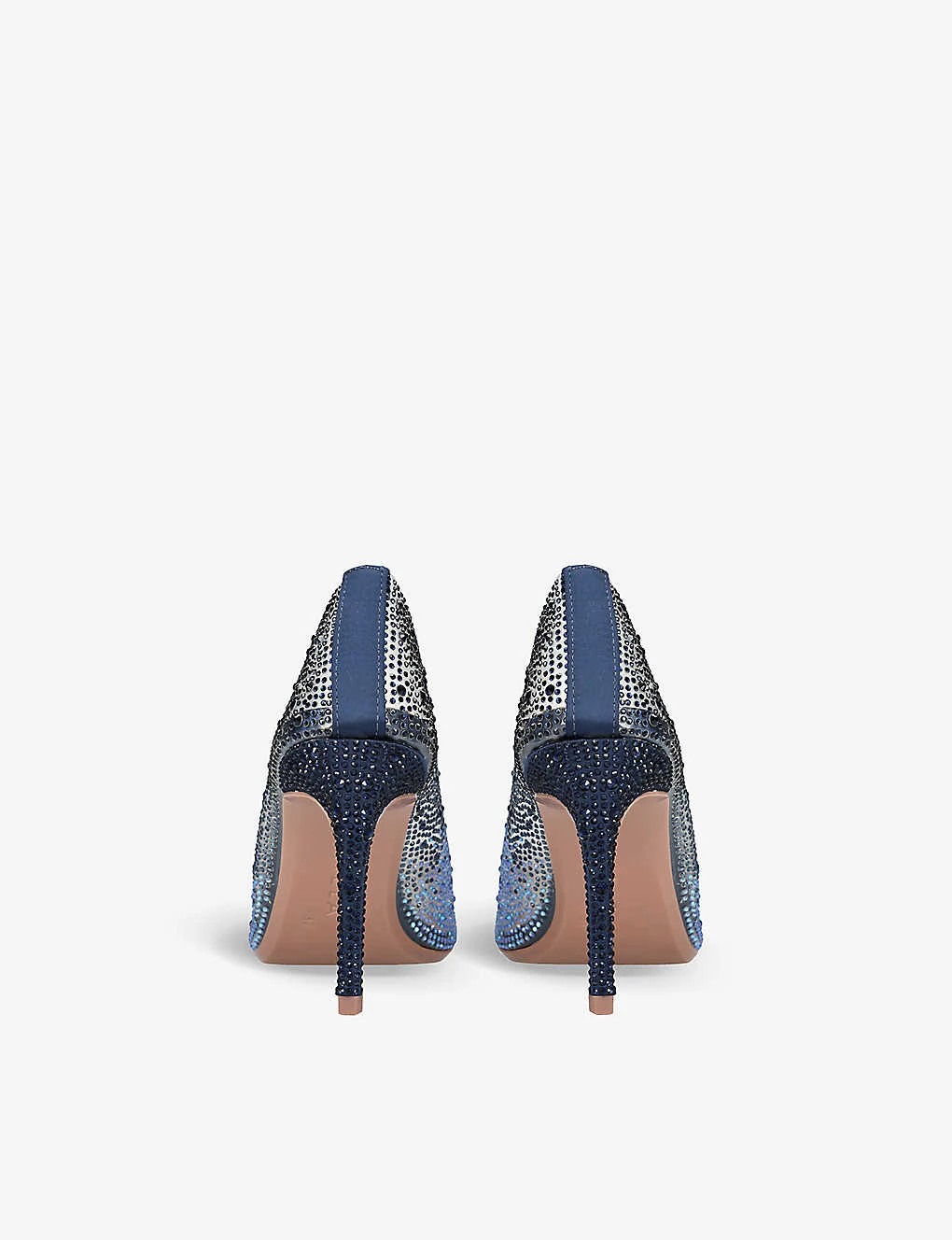 - Pointed toe, closed toe, tonal stitching, satin upper, crystal embellishment, stiletto heel