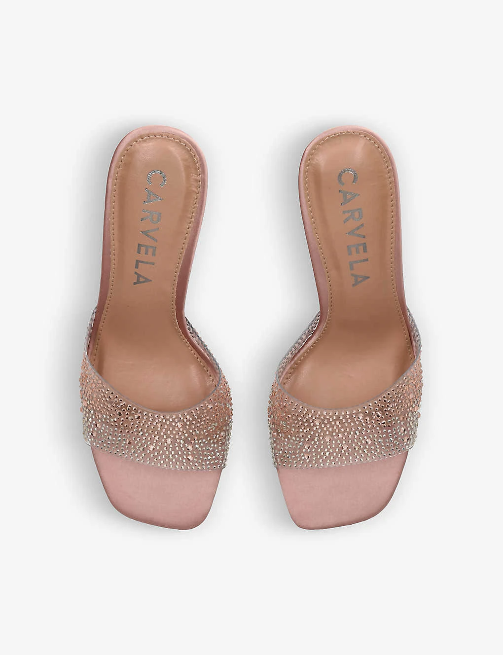 - Open square toe, translucent wide toe strap, open back, high stiletto heel, crystal embellishments at toe strap and heel, branded footbed