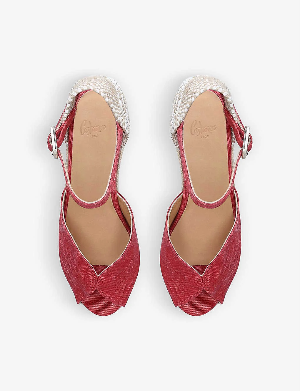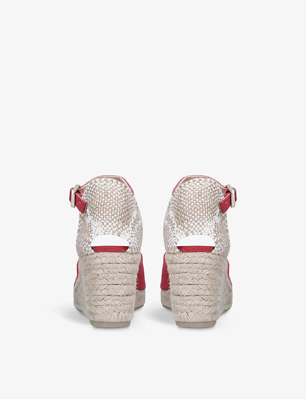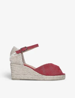 - Open toe, ankle strap, raffia wedge heel, silver-tone hardware