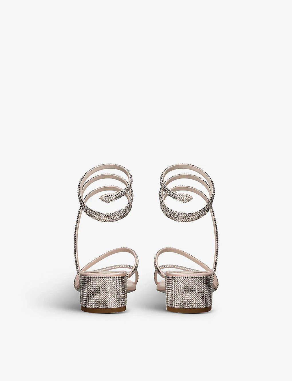 - Round toe, open toe, asymmetrical toe bands, all-over crystal-embellished snake wrapped around the heel, block heel, handmade, branded insole