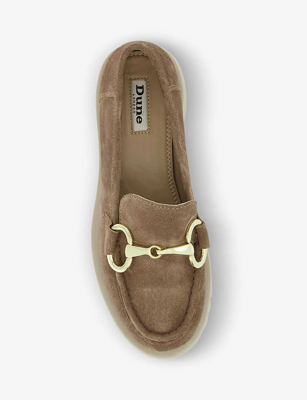 - Round toe, piped stitching, horsebit detail across the vamp, gold-tone hardware, contrasting chunky cleated sole