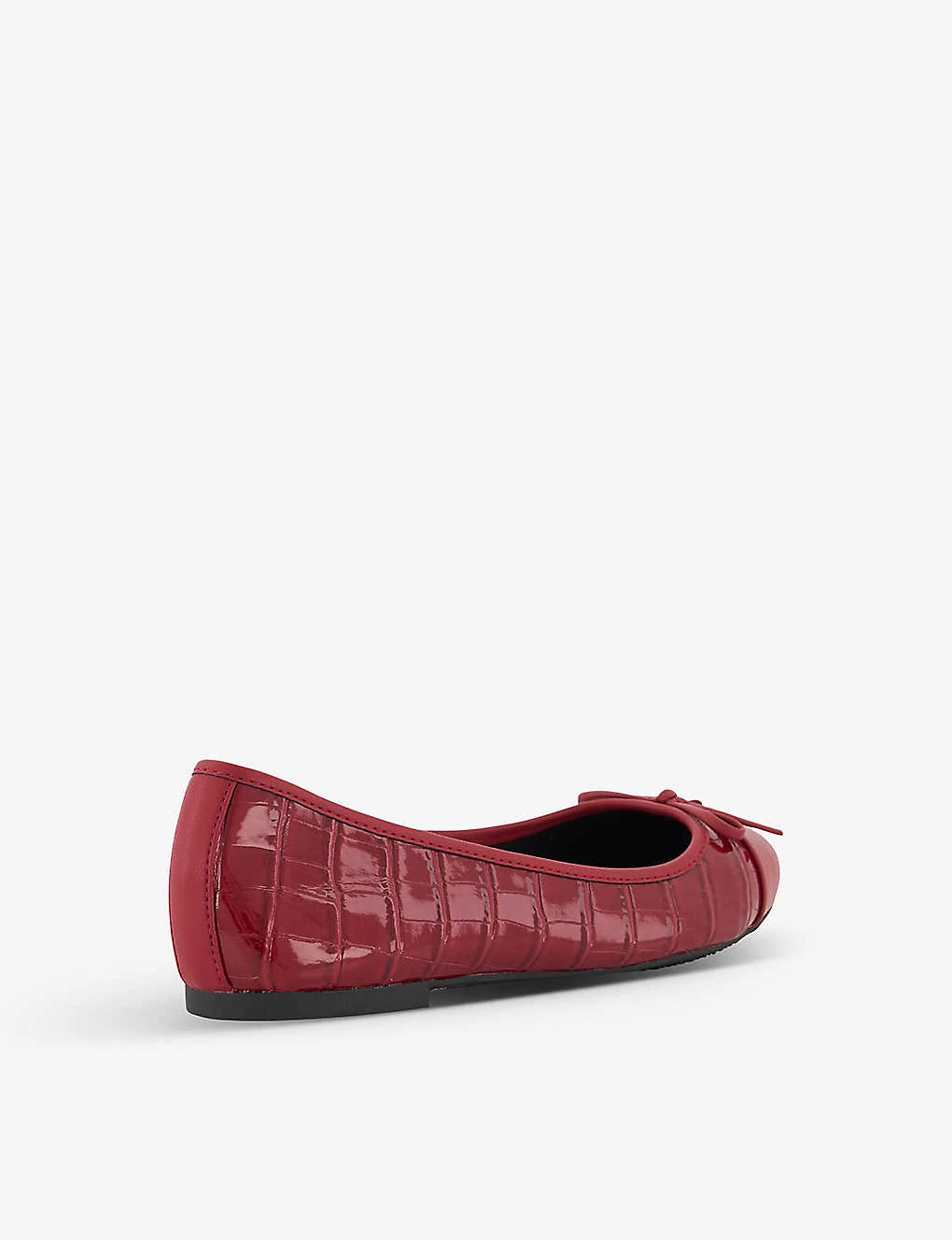- Round toe, flat sole, gold-tone hardware, charm detail, bow embellishment at the front, mock crocodile emboss at sides