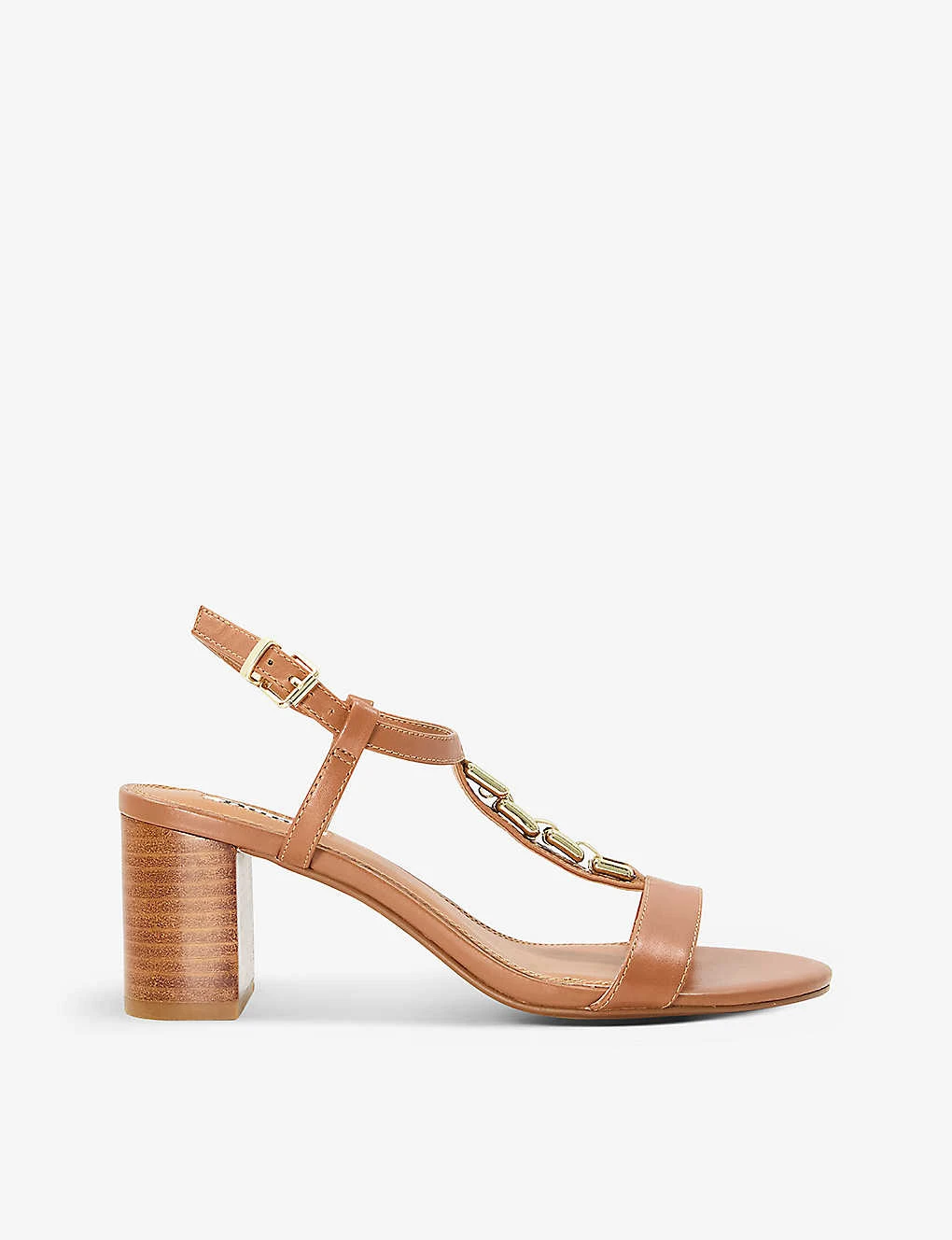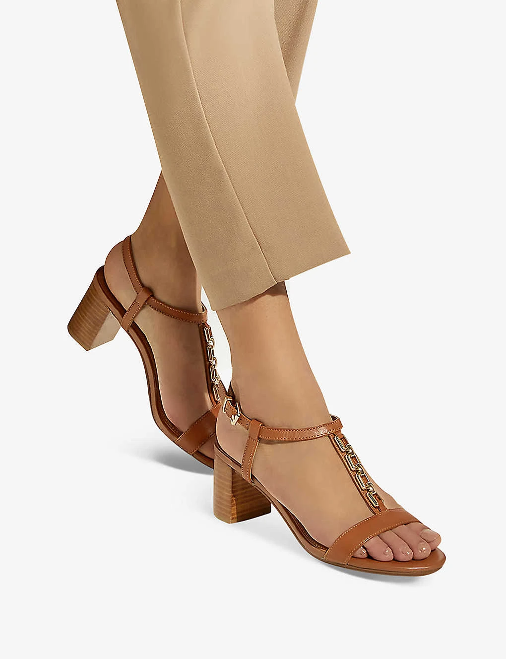 - Round toe, block heel, front strap, chain at centre front, slim ankle straps