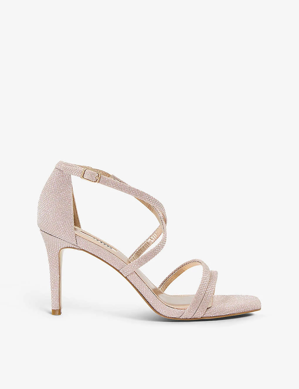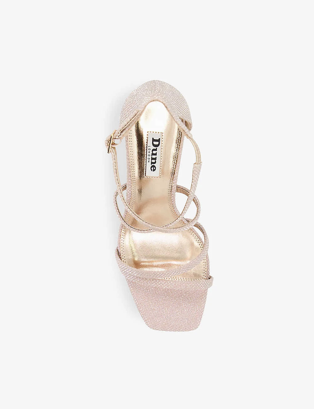 - Square toe, open toe, crisscrossing straps, metallic finish