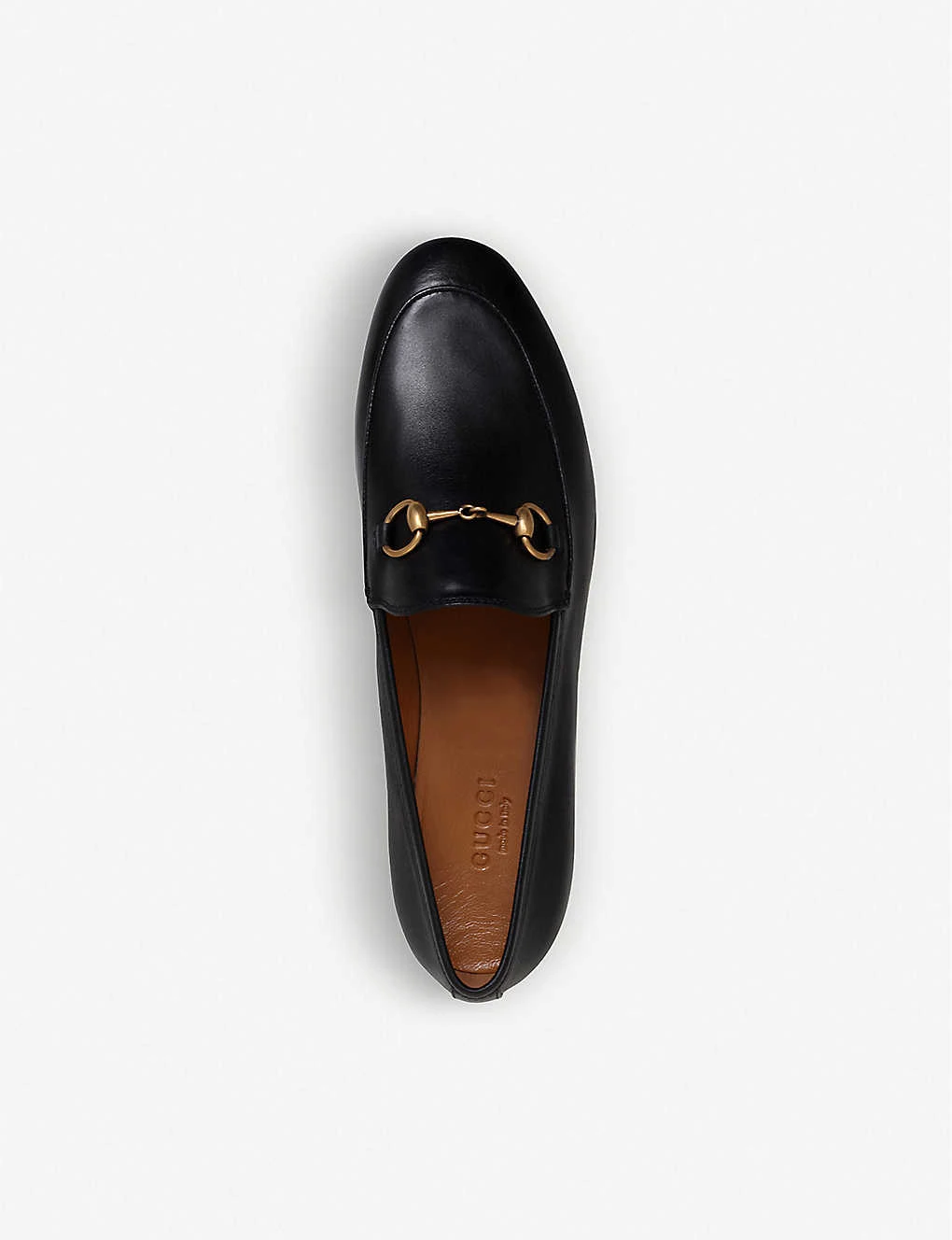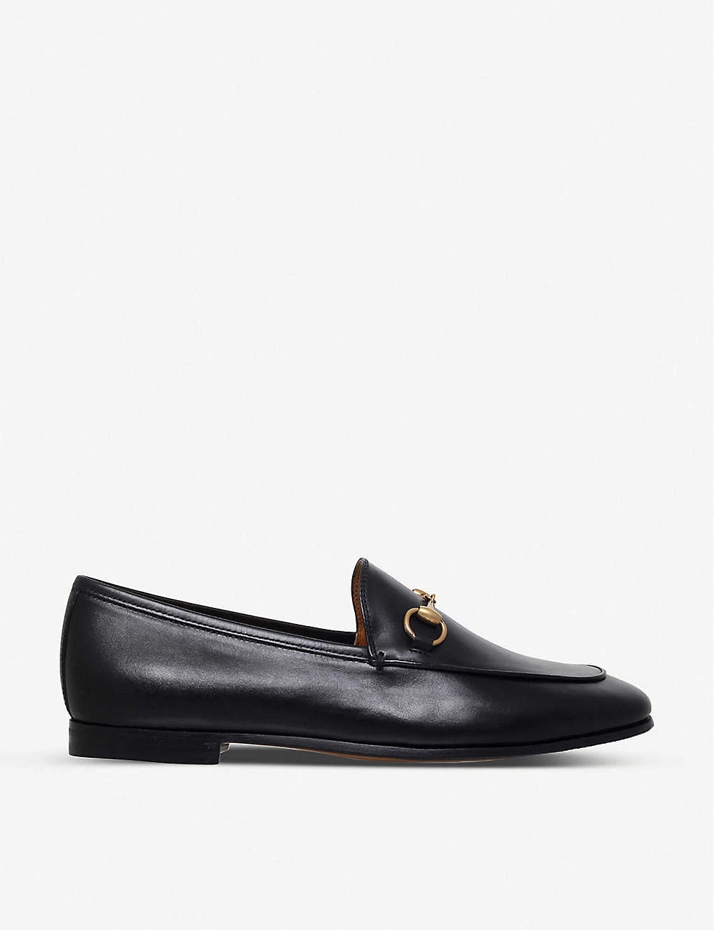 Gucci leather loafers Slip on Apron toe, gold-toned horsebit detail, flat heel Leather upper, lining and sole Heel height 0.5″” Made in Italy