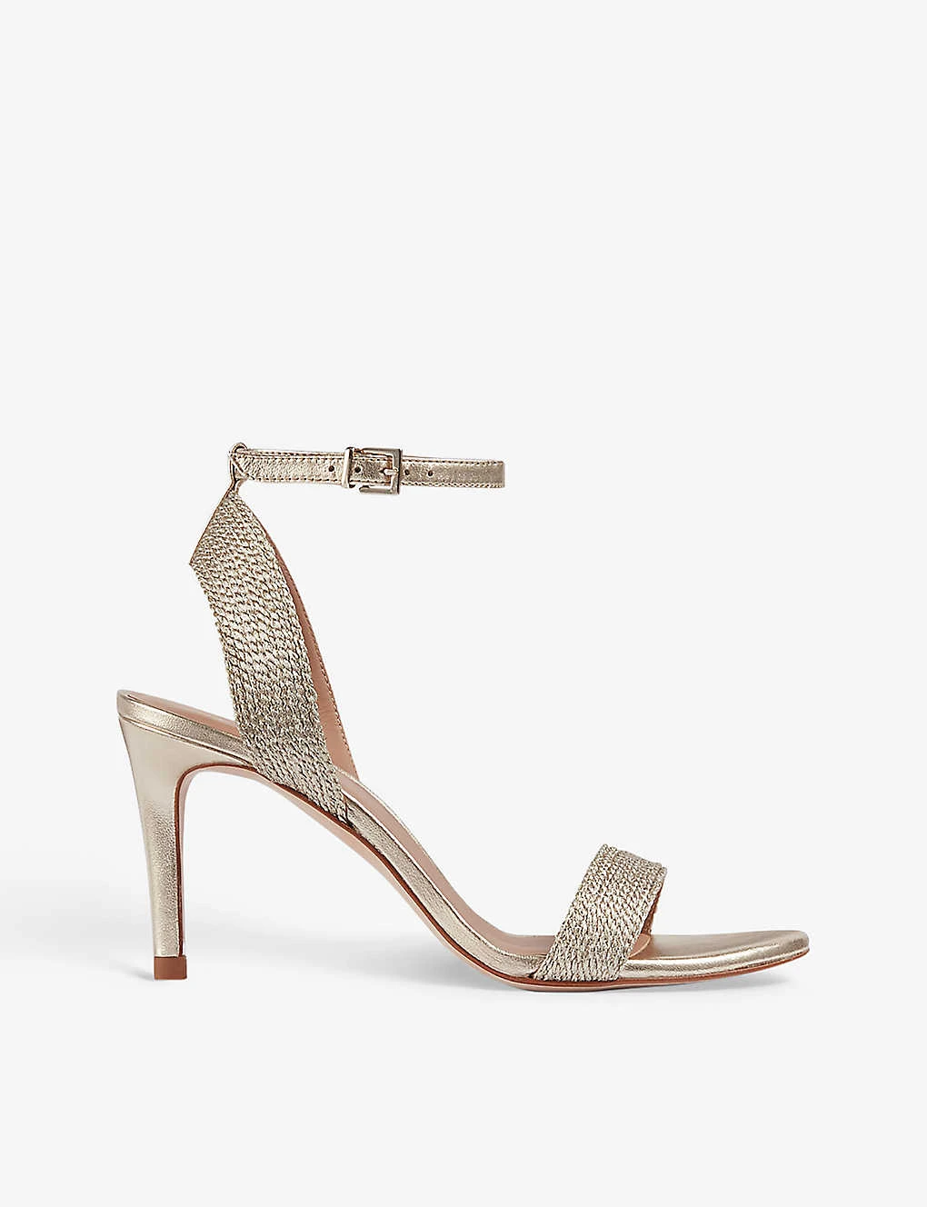 - Round toe, stiletto heel, open toe, metallic textured straps