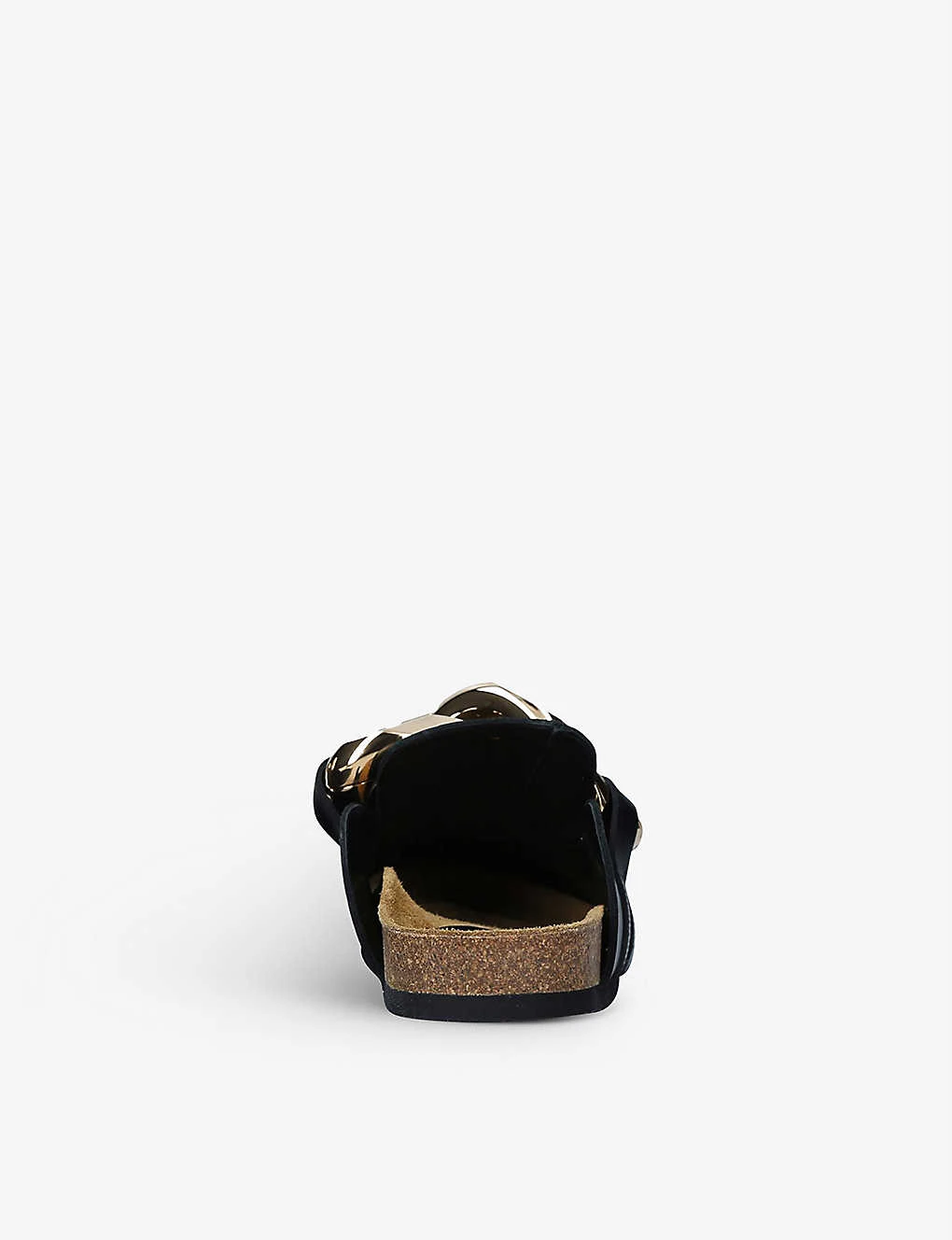- Backless, closed toe, round toe, gold-toned hardware, chunky chain embellishment at front, chunky flat sole
