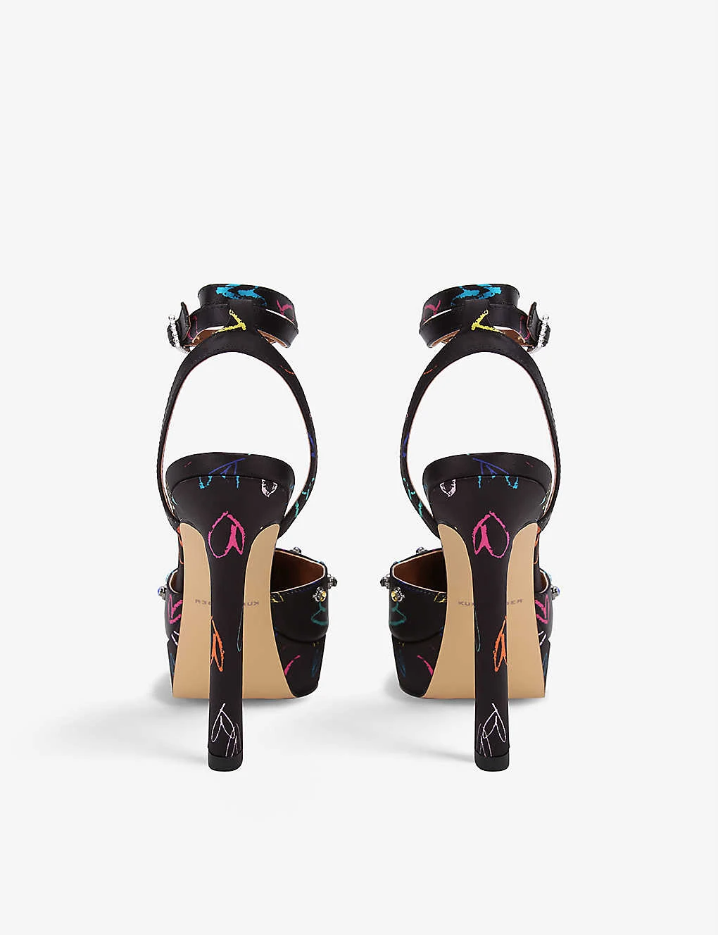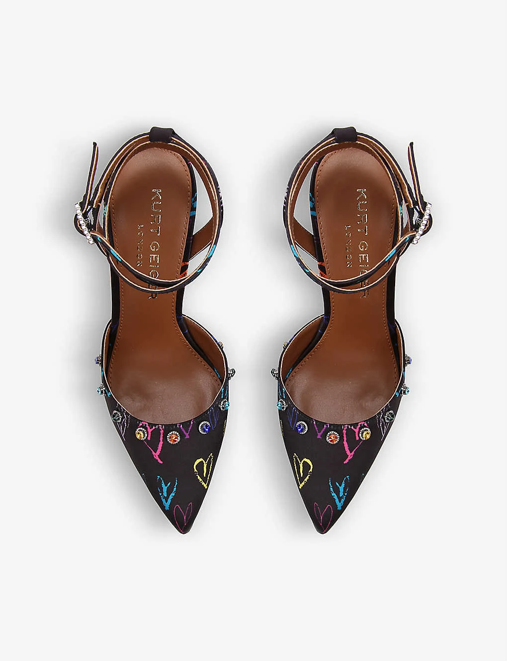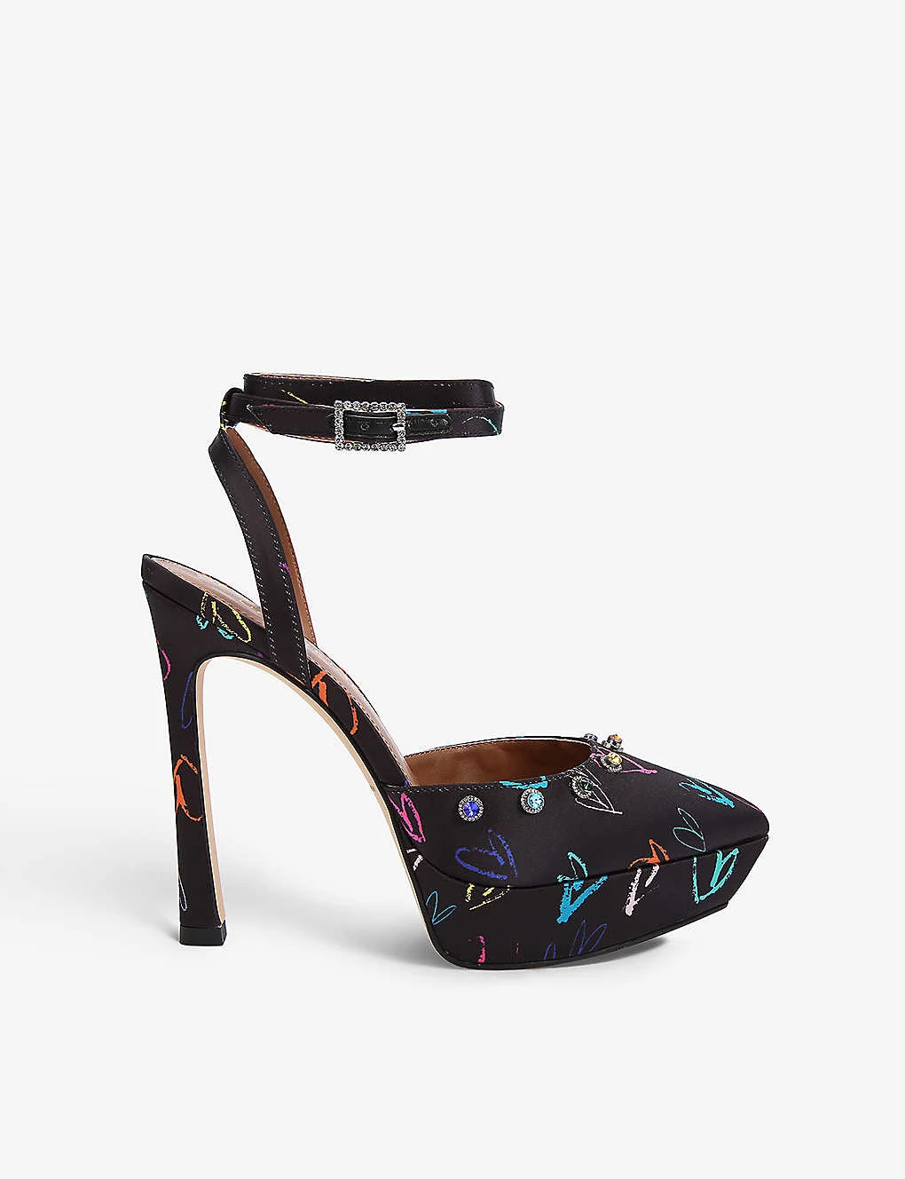 - Pointed toe, platform heel, all-over hand-drawn heart print, crystal embellishments across the toe, crystal-embellished buckle