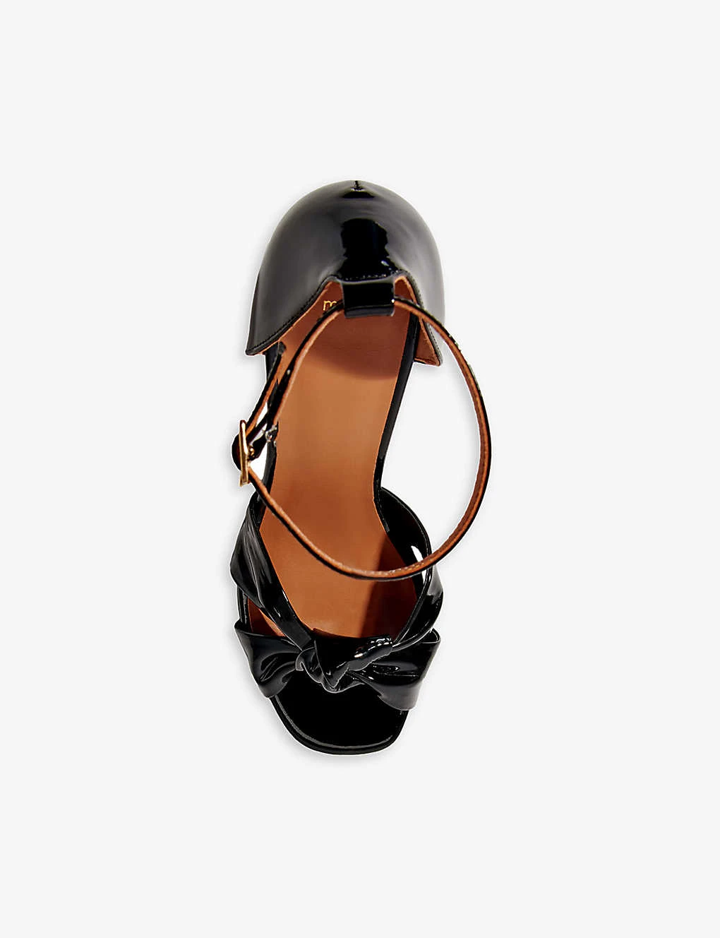 - Open square toe, platform sole, high block heel, patent finish, knotted toe strap, adjustable ankle strap, gold-tone logo charm
