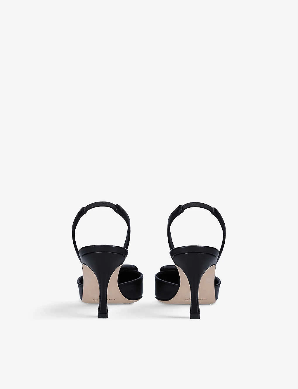 - Pointed toe, suede buckle embellishment, slingback, kitten heel