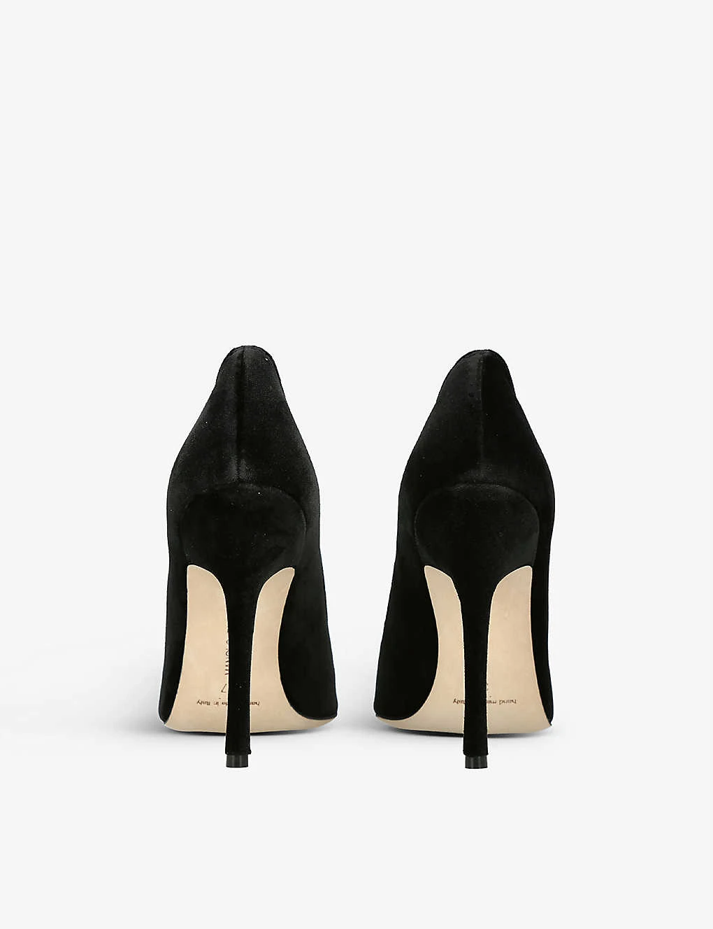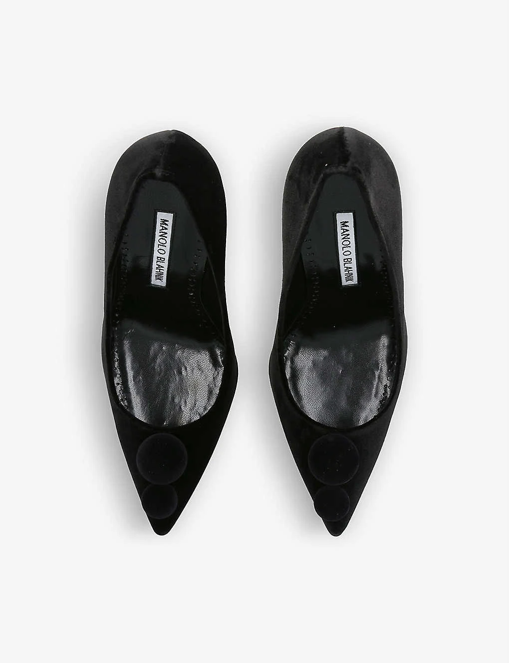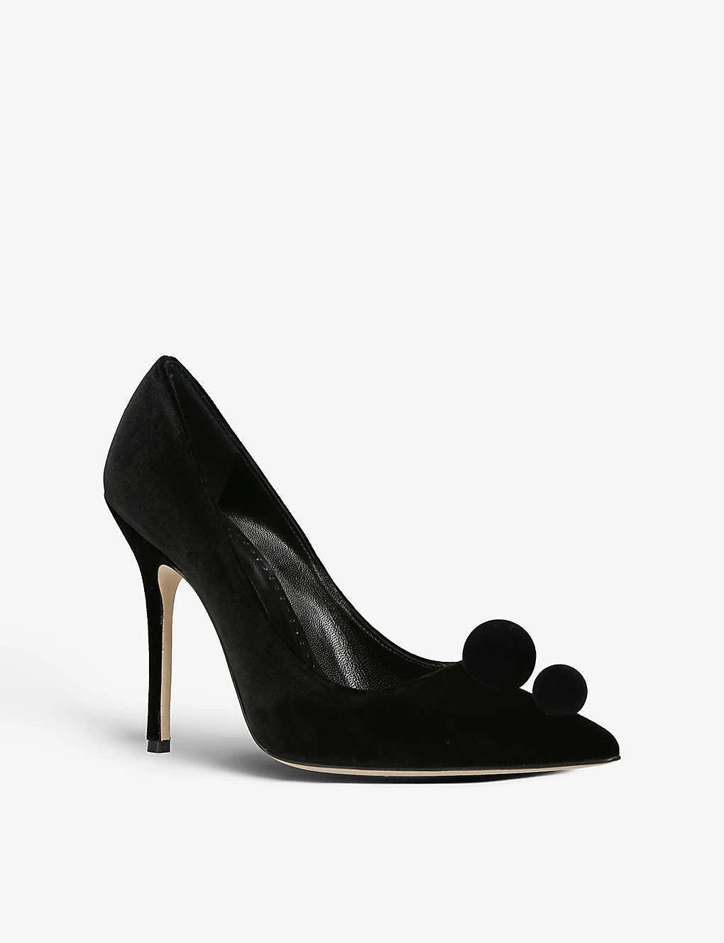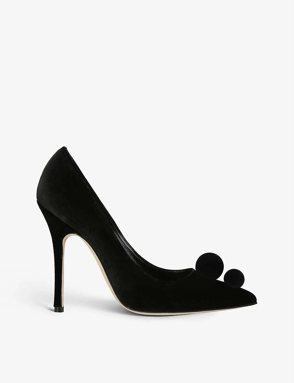 - Pointed toe, pom pom-embellished toe, stiletto heel
