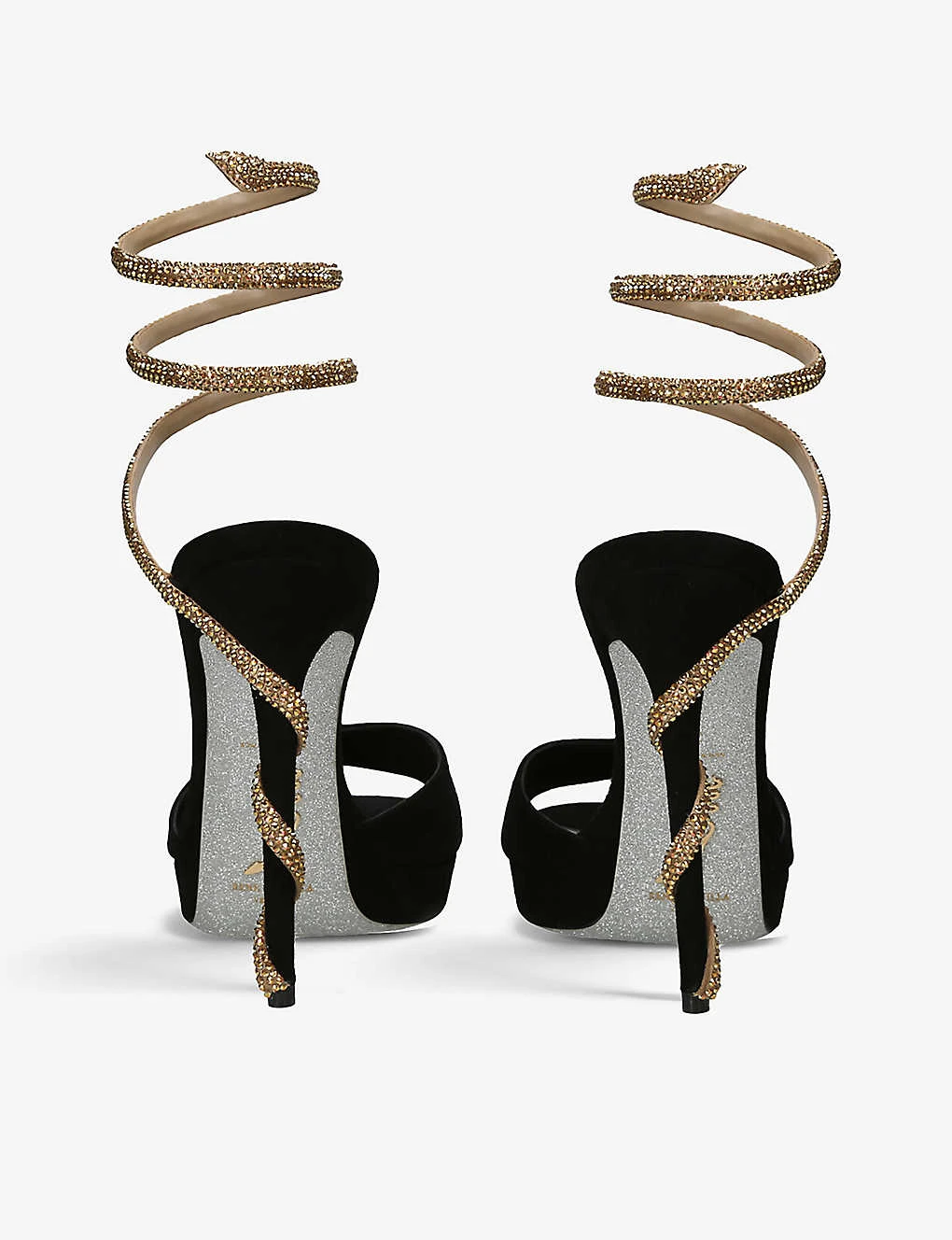 - Round toe, open toe, suede toe strap, embellished snake charm at ankle, stiletto heel, brand logo at heel