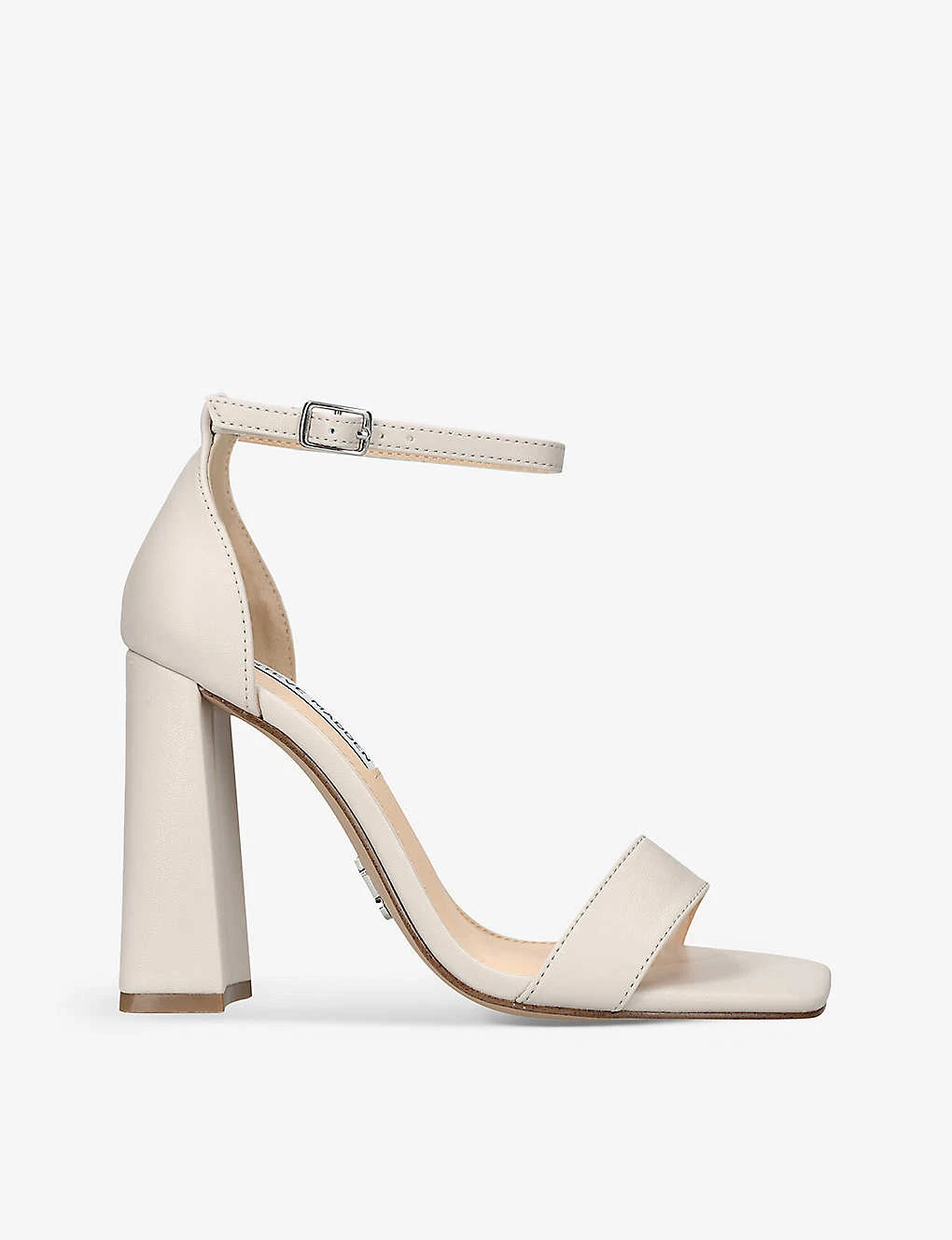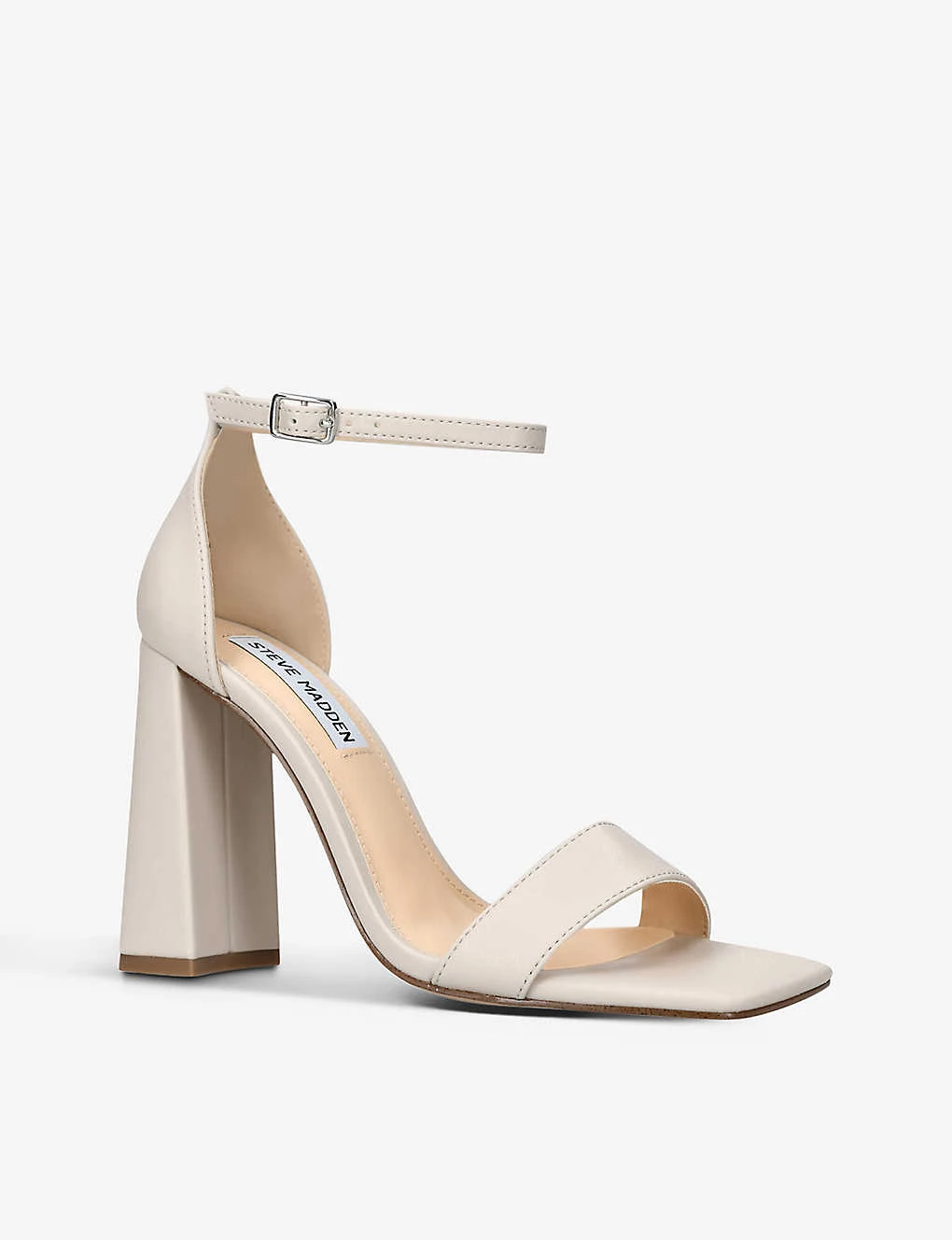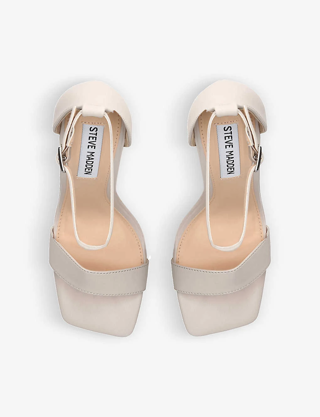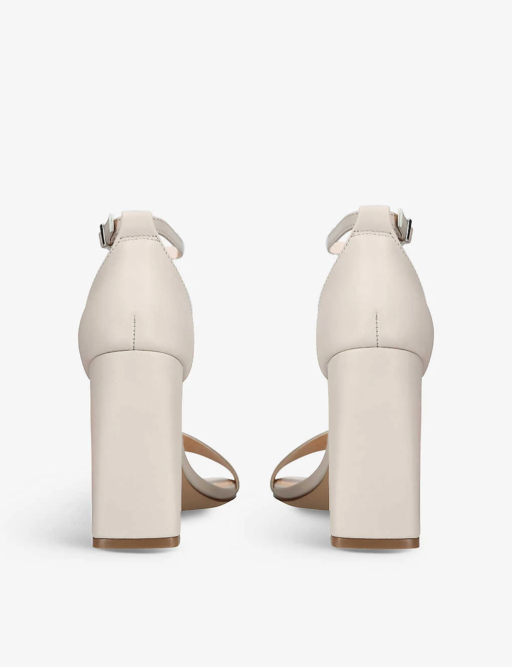 - Open toe, square toe, top strap, block heel, silver-tone hardware
