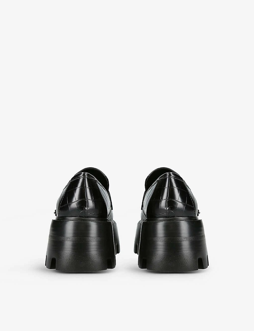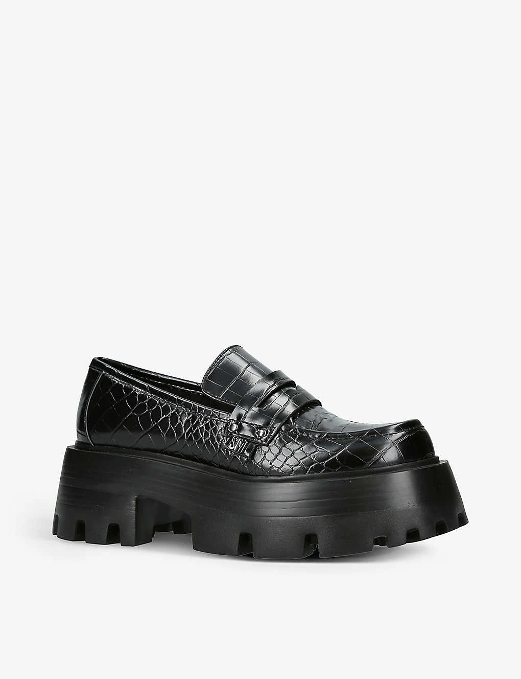 - Round toe, croc embossed upper, front strap, logo at side, chunky sole