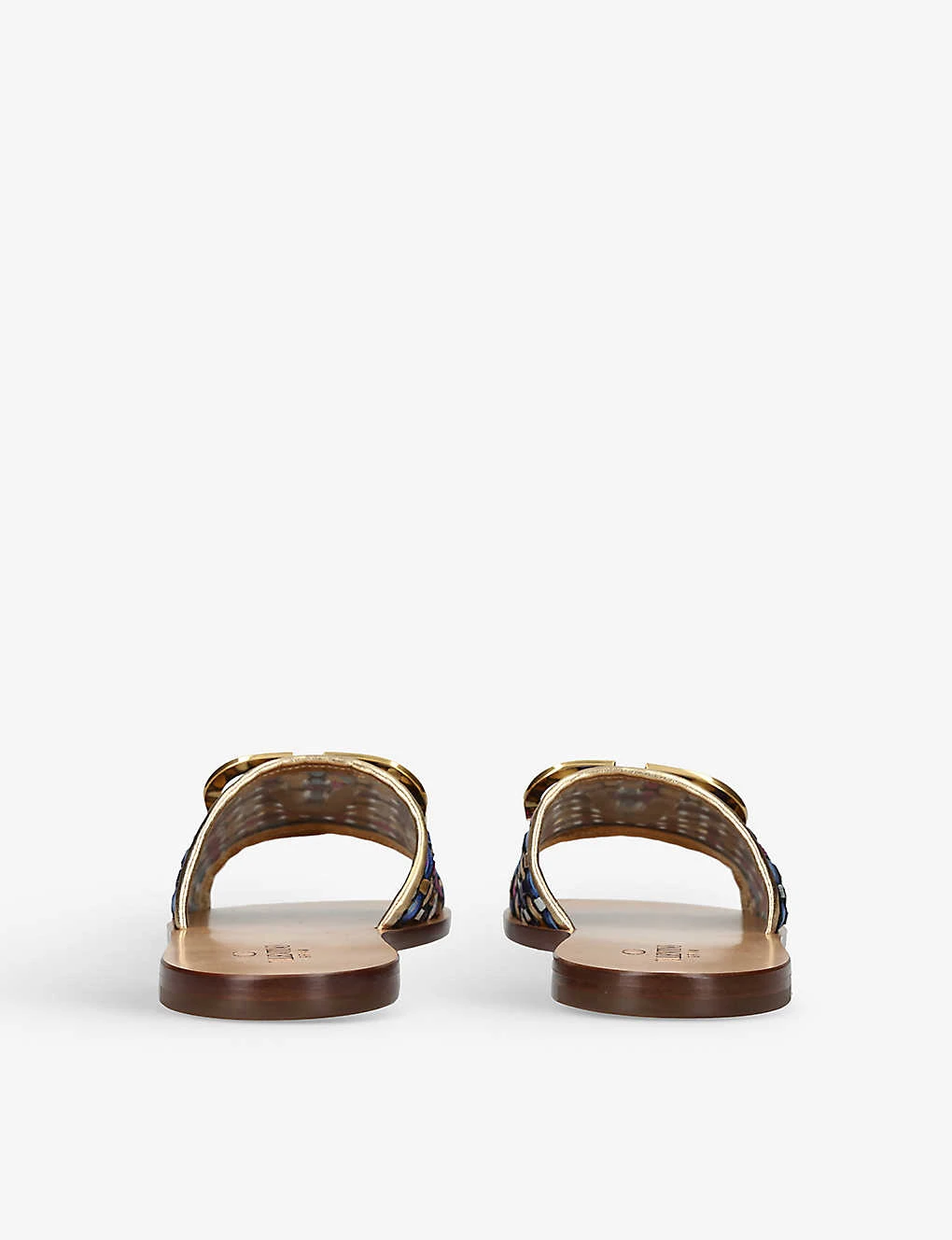 - Round toe, open toe, metallic motif at strap, logo plaque at strap, logo embossed at insole, gold-tone hardware