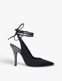 - Pointed toe, stiletto heel, slingback strap, crystal-embellished heel, ribbon laces at ankle