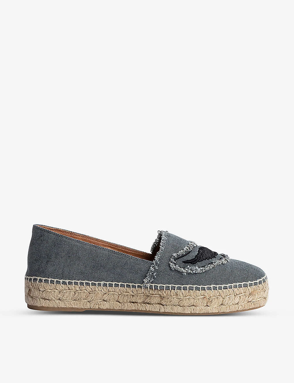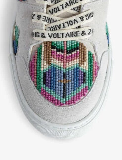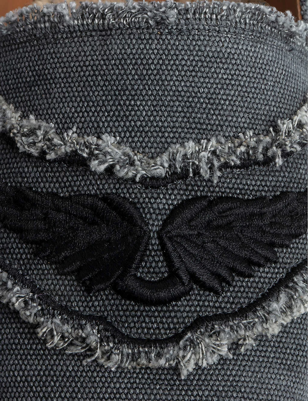 - Round closed toe, embroidered wing patch at front, fringe embellishment at front, contrast sole